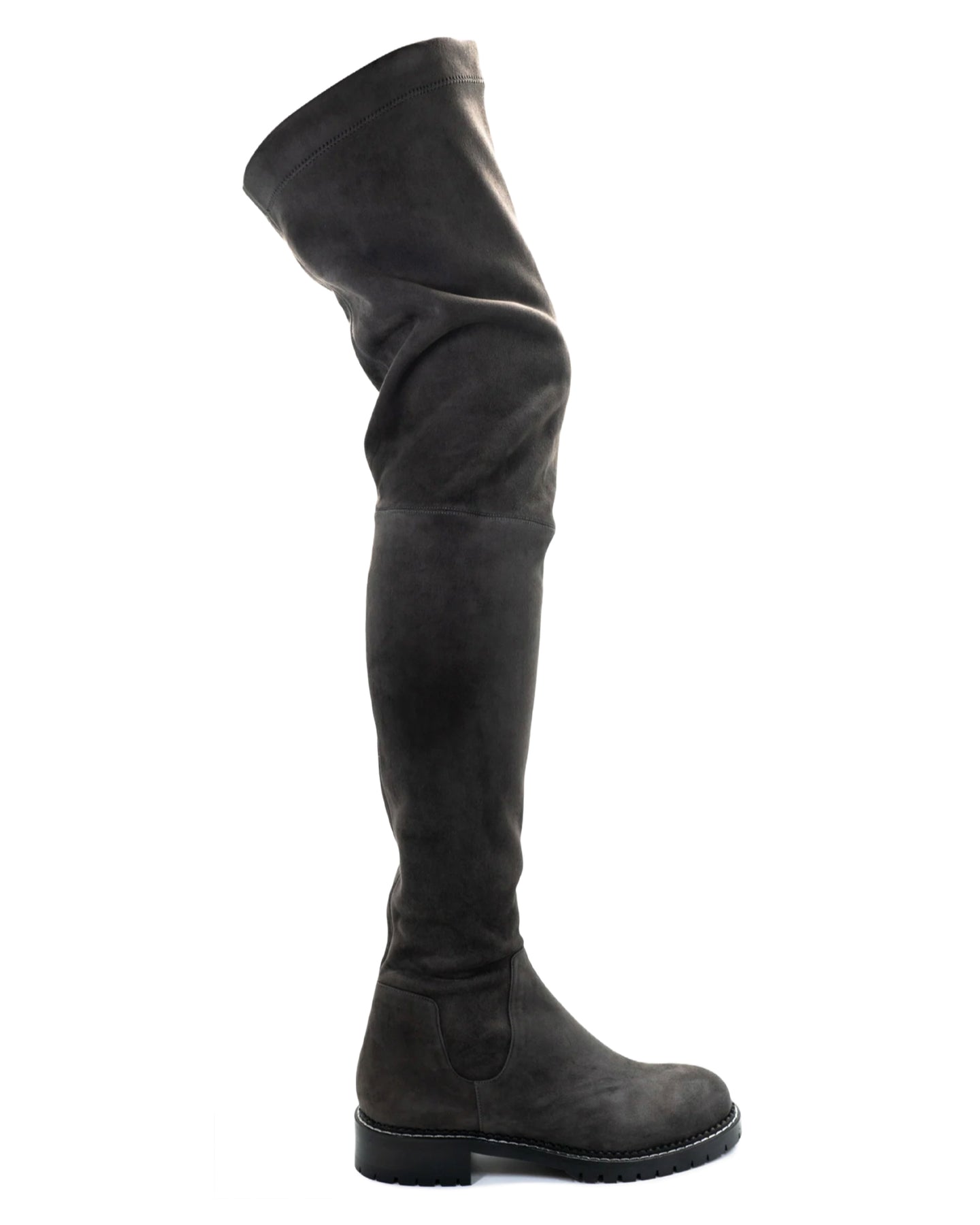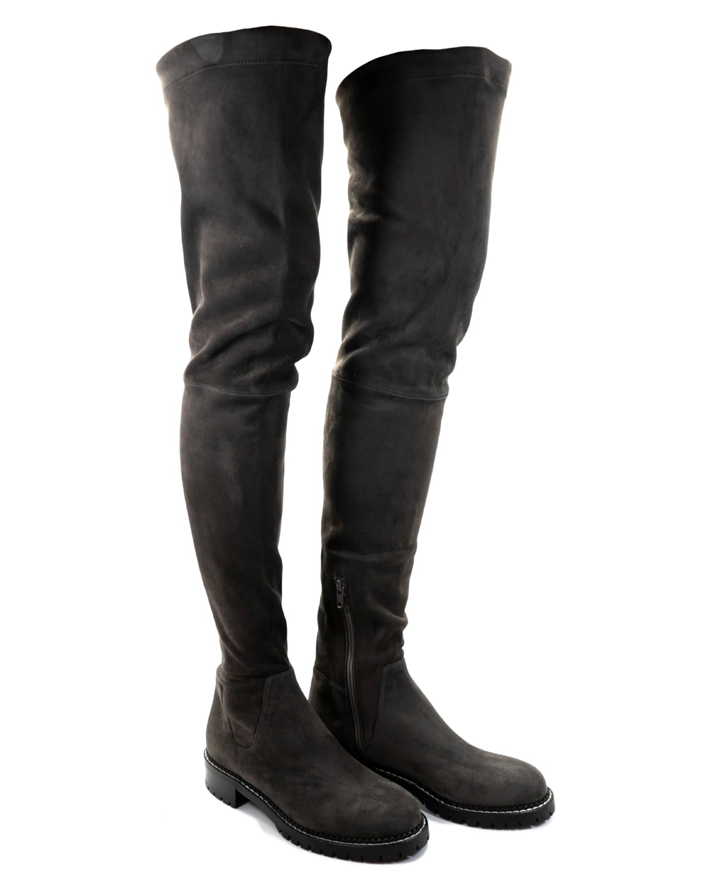 An over-the-knee fitted stretch boot crafted from elasticized suede, featuring an inside zipper closure at the ankle and a deeply treaded lug sole for durability and style.