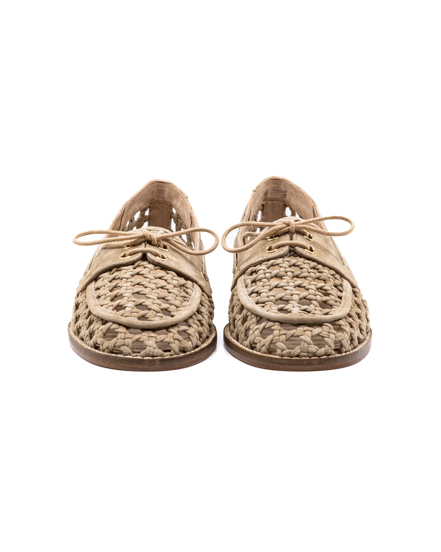A chic loafer crafted from crochet and woven suede for a perfect blend of casual and refined.