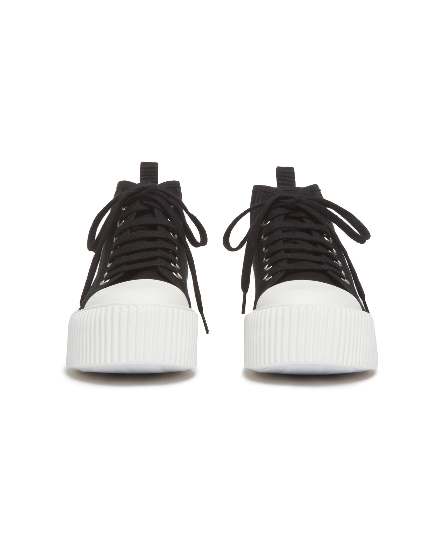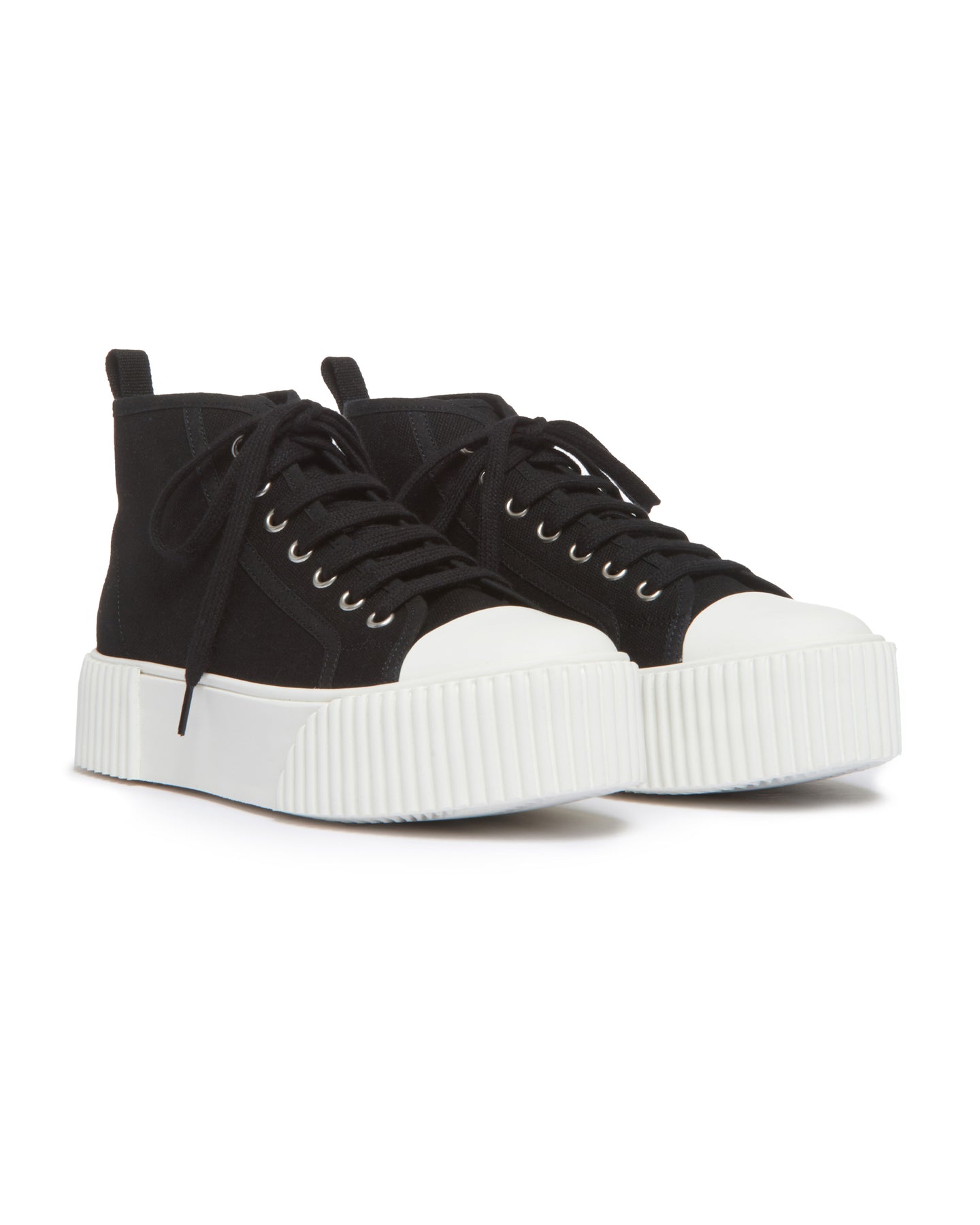 A high-top sneaker with a canvas upper, soft canvas lining, 40mm white rubber sole, silver metal eyelets, and lace-up front.