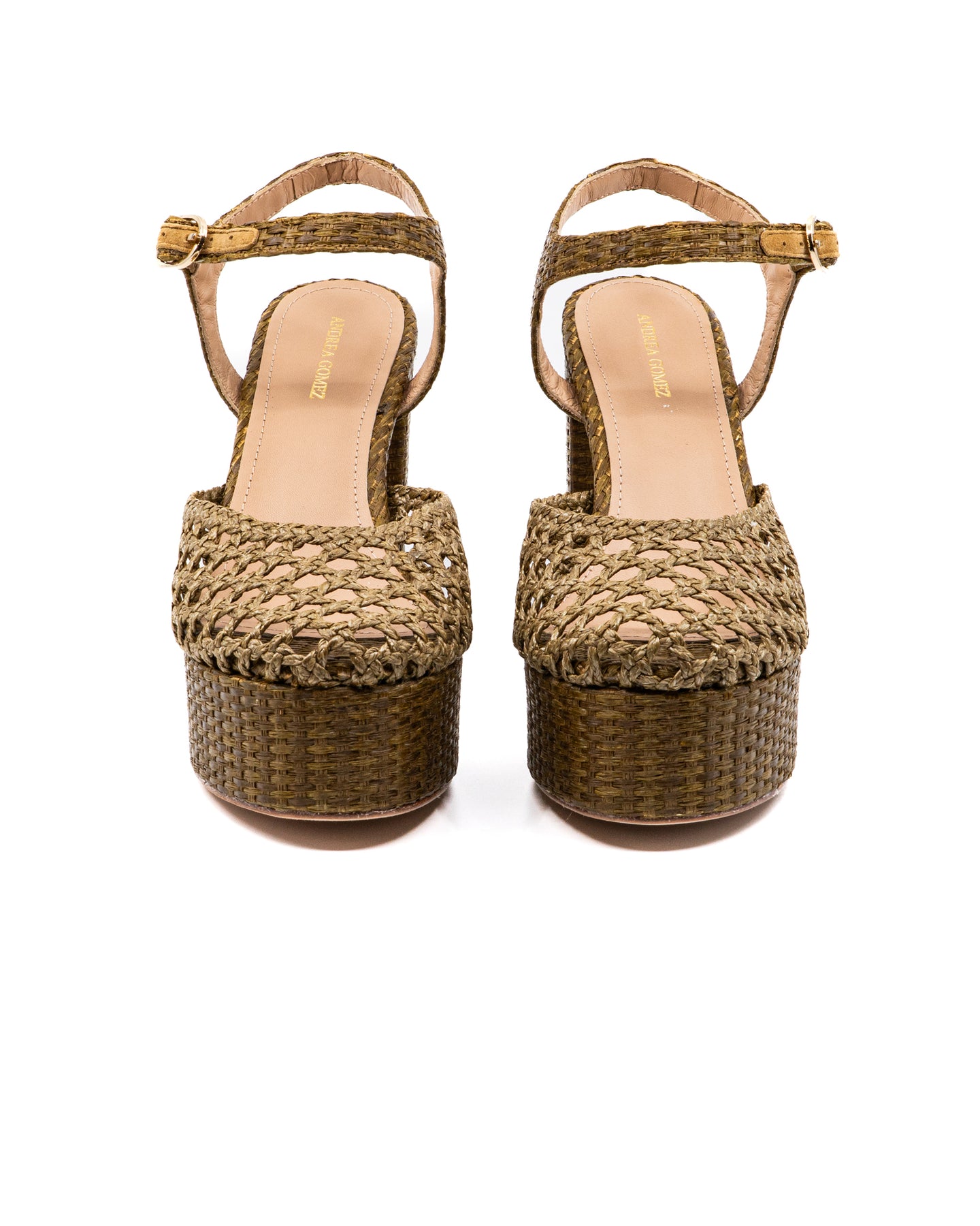 Handmade from woven raffia, this closed-toe platform features a walkable block heel and a buckled ankle strap for secure footing.