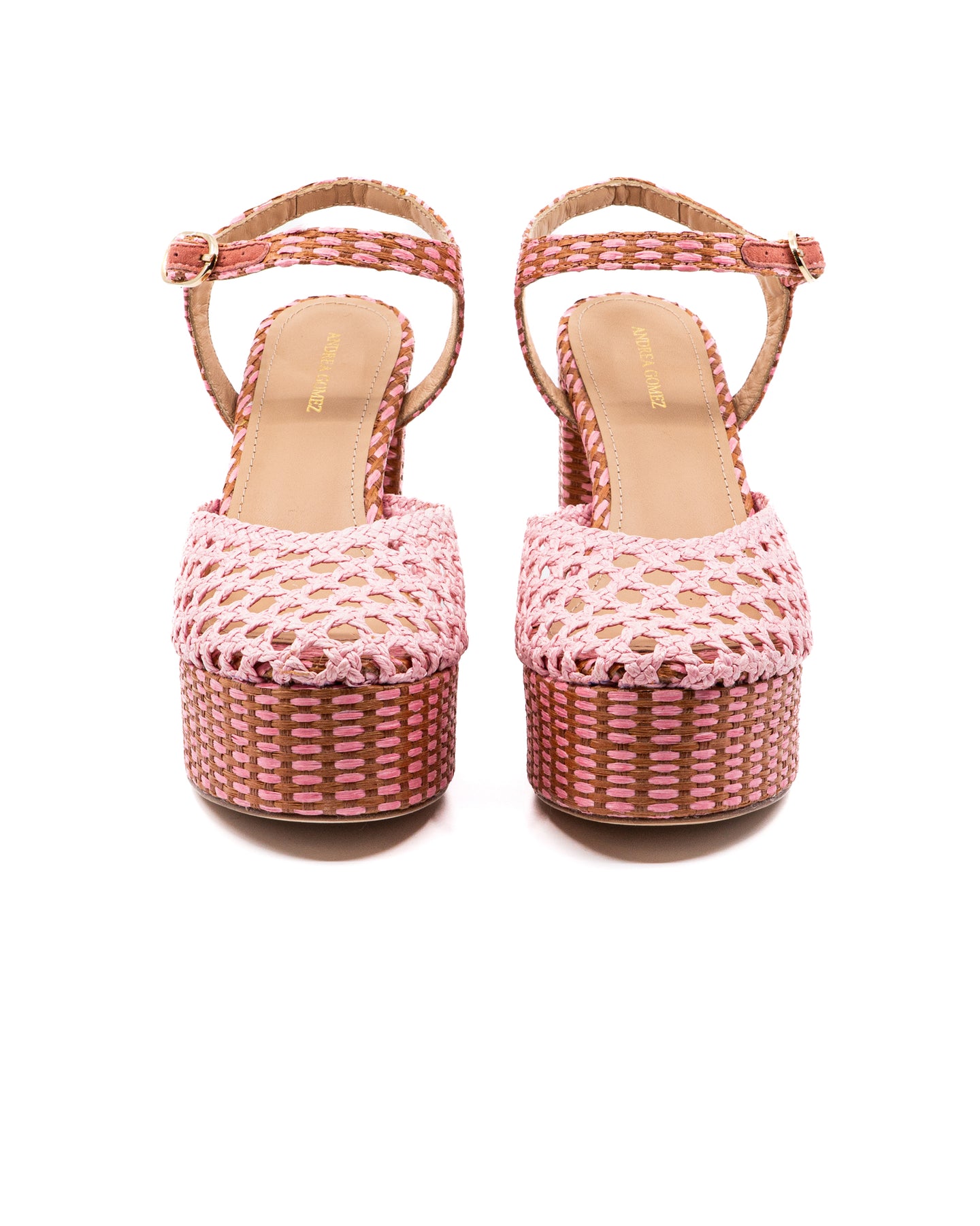 Handmade from woven raffia, this closed-toe platform features a walkable block heel and a buckled ankle strap for secure footing.